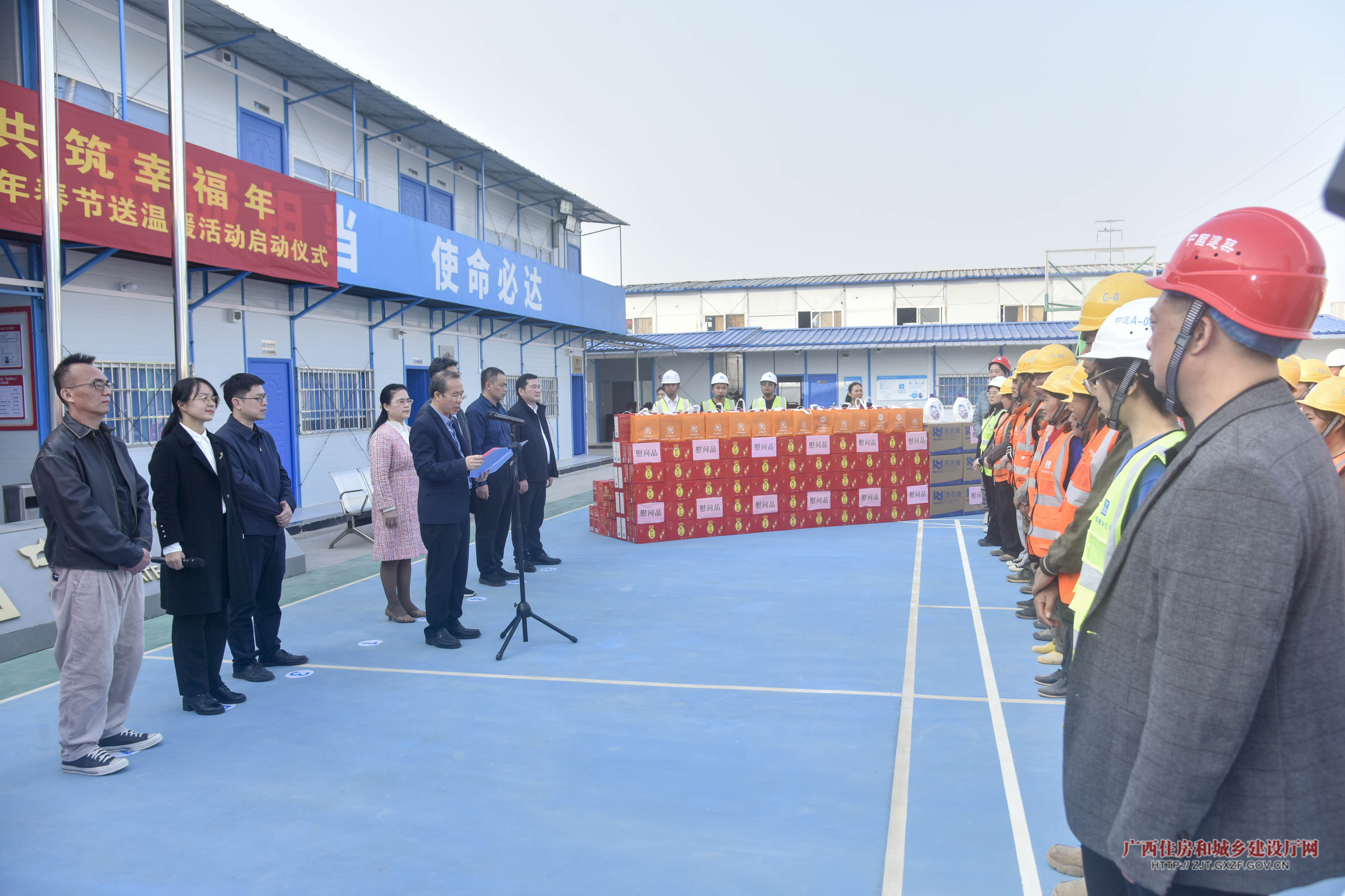 自治区住房城乡建设厅、自治区总工会相关处室(单位),中建五局广西建设有限公司负责人以及工友代表等参加活动。(黄诗谊/文、图)