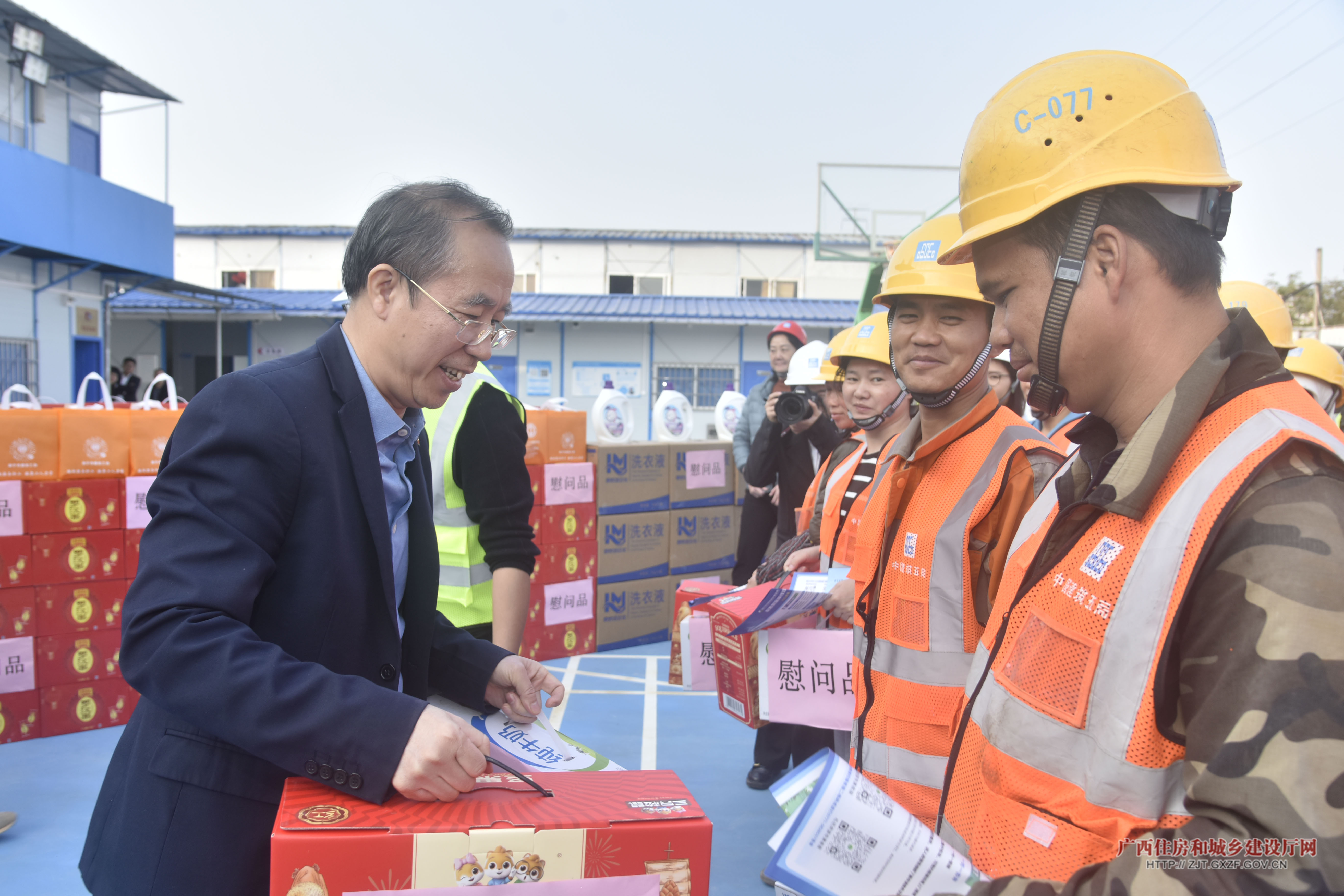 自治区住房城乡建设厅党组成员、副厅长于斌为工地农民工代表赠送慰问品