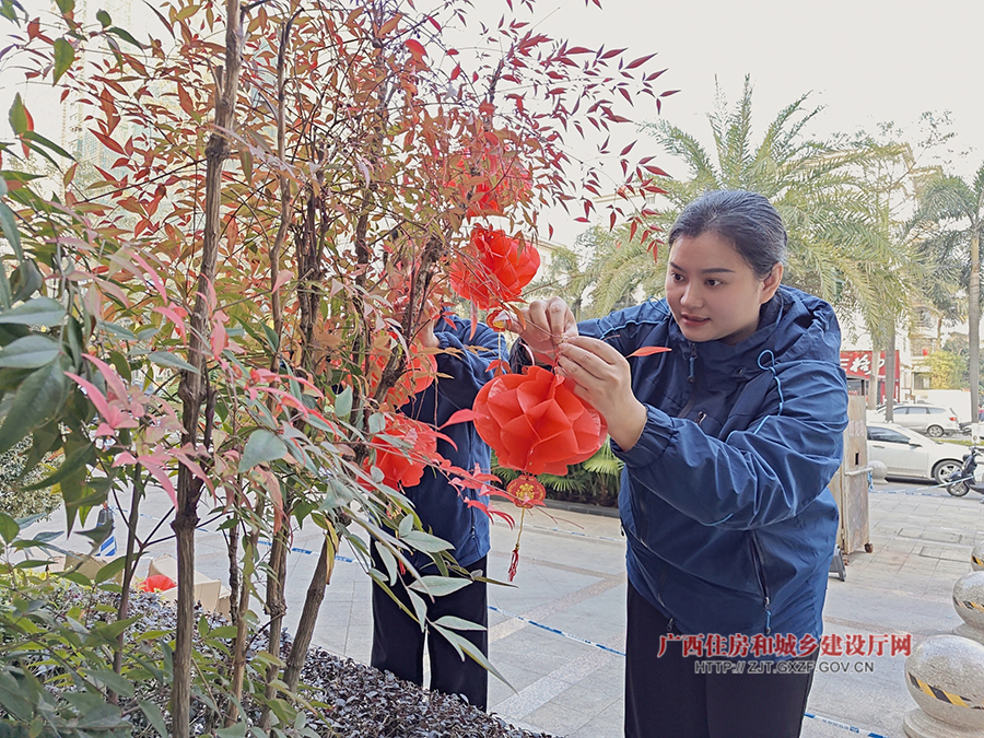 春节前夕,物业人员忙着为小区张灯结彩,营造喜庆迎新氛围