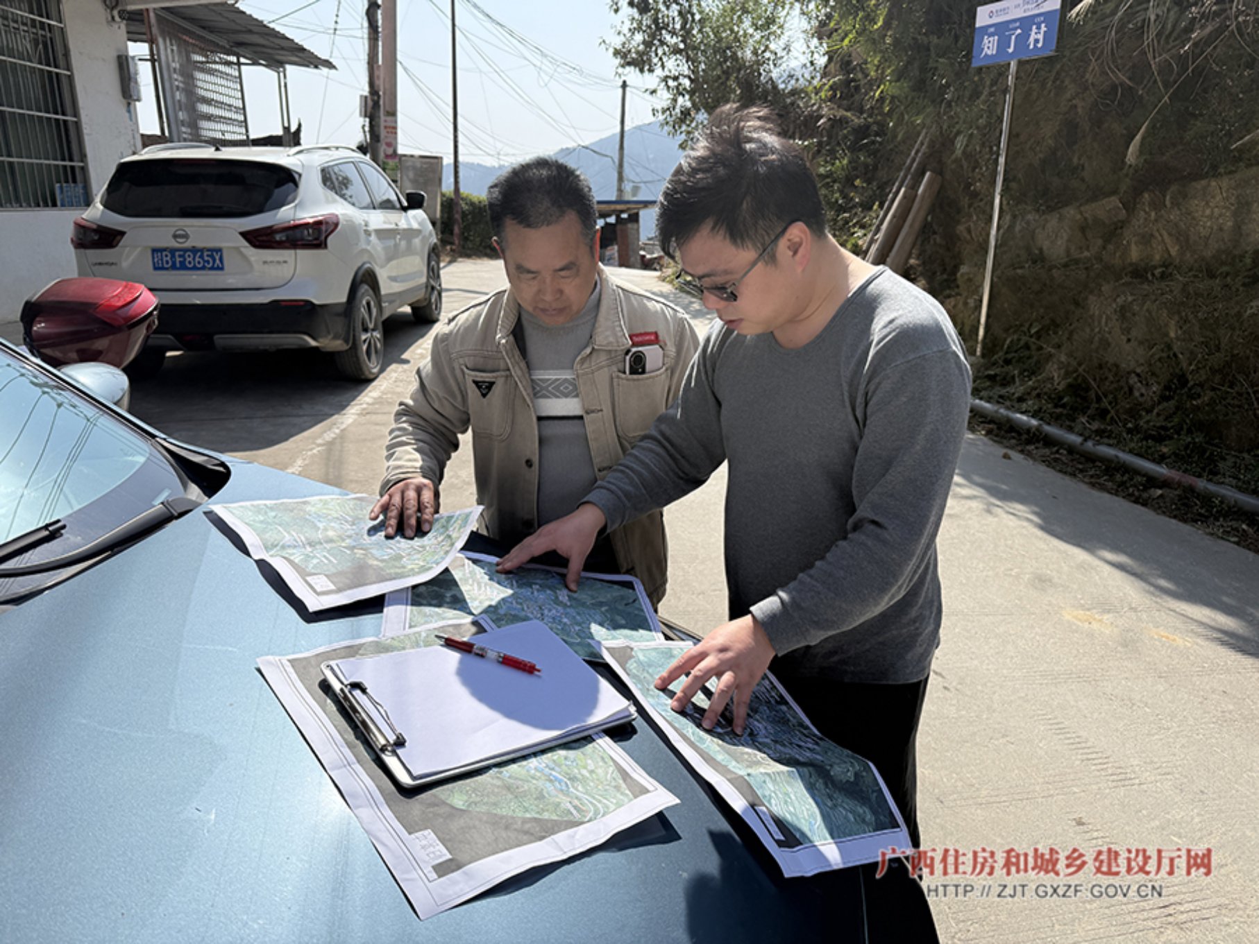 邓松柏(右一)与村委干部查看工作图纸(三江县住建局供图)