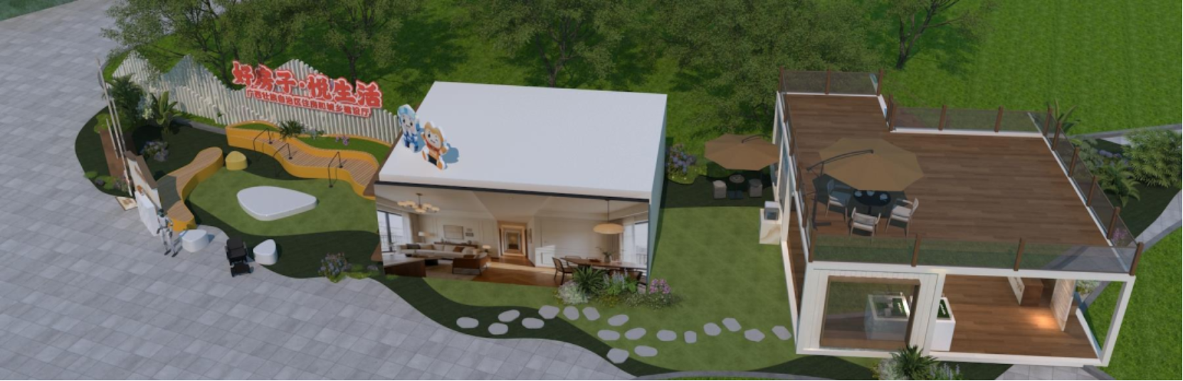 楼下小院:绿植休闲区+邻里互动空间,搭配好房子主题快板表演,热闹又接地气;