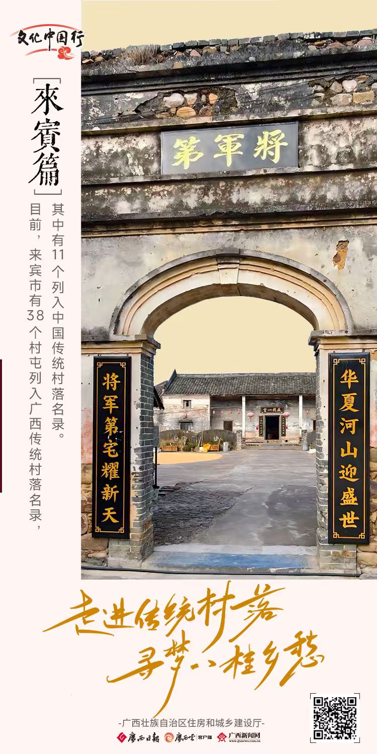 来宾,北倚巍峨大瑶山,南接广袤平川,奔腾的红水河浸润着沃野千里,古老的村落嵌于峰林秀水间,干栏飞檐轻展身姿,石墙炮楼静默矗立,青石板巷道曲折延伸,青砖黛瓦映着朝暮光影,古井古榕诉说着世代的烟火温情。