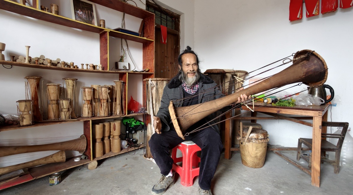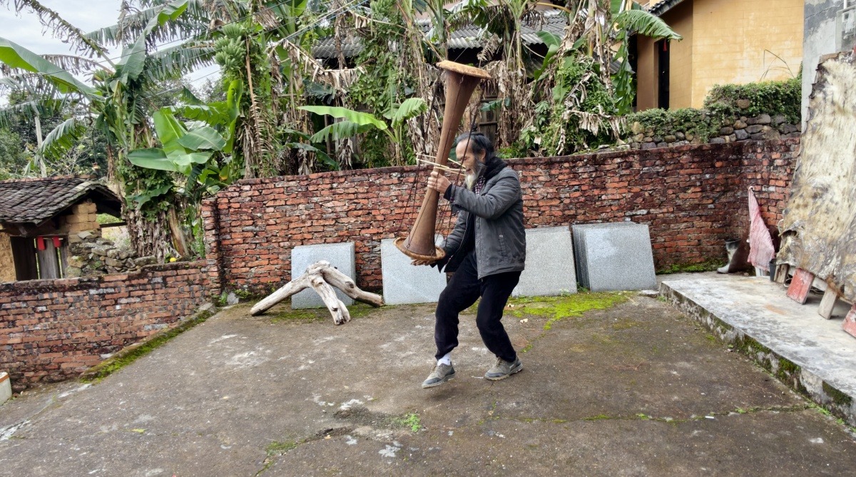 当地黄泥鼓舞非遗传承人展示黄泥鼓