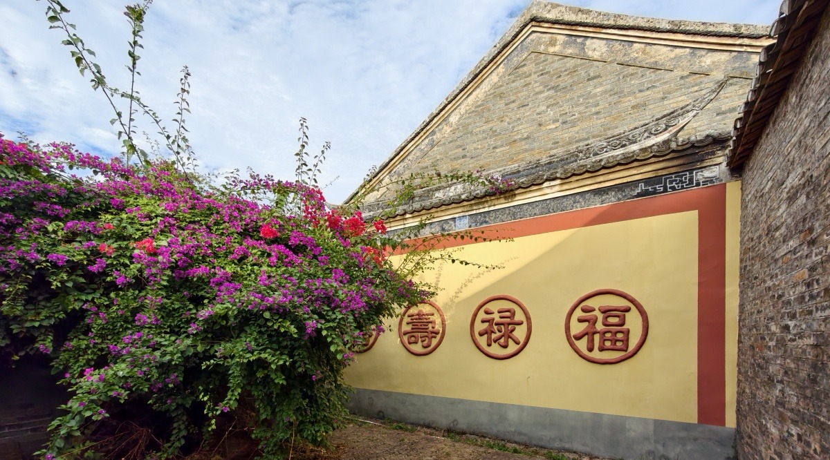 建筑外墙镶嵌“福”“禄”“寿”“喜”装饰,寓意吉祥