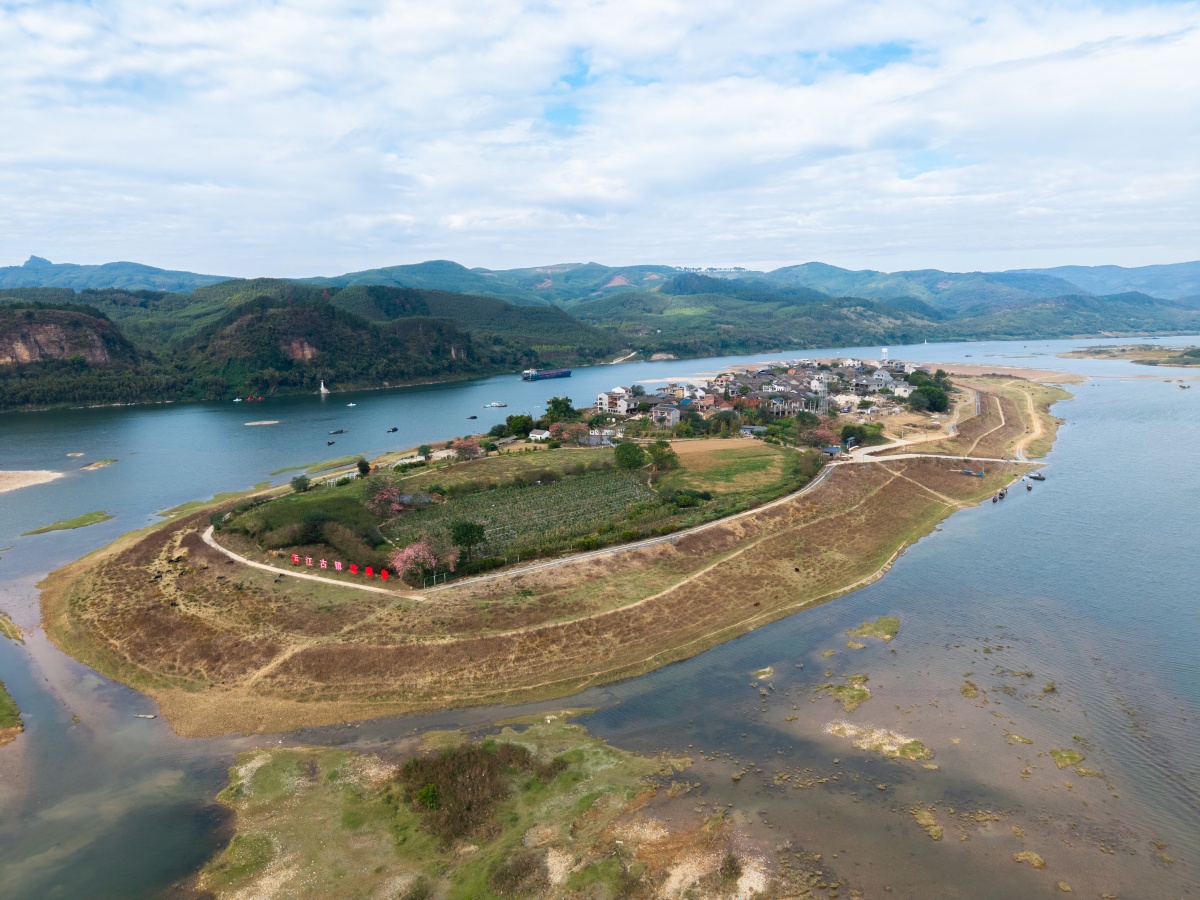 丰水期,河水淹没河床,村民和游客只能坐船过河才能过到小岛上的古镇。如果是枯水期,人则可以直接踩着鹅卵石走过浅水的河床。这座古镇因其地形与抗洪特性,又被当地人形象地称为“葫芦地”,传说洪水泛滥时,它总能如葫芦般浮于水面,护佑一方。