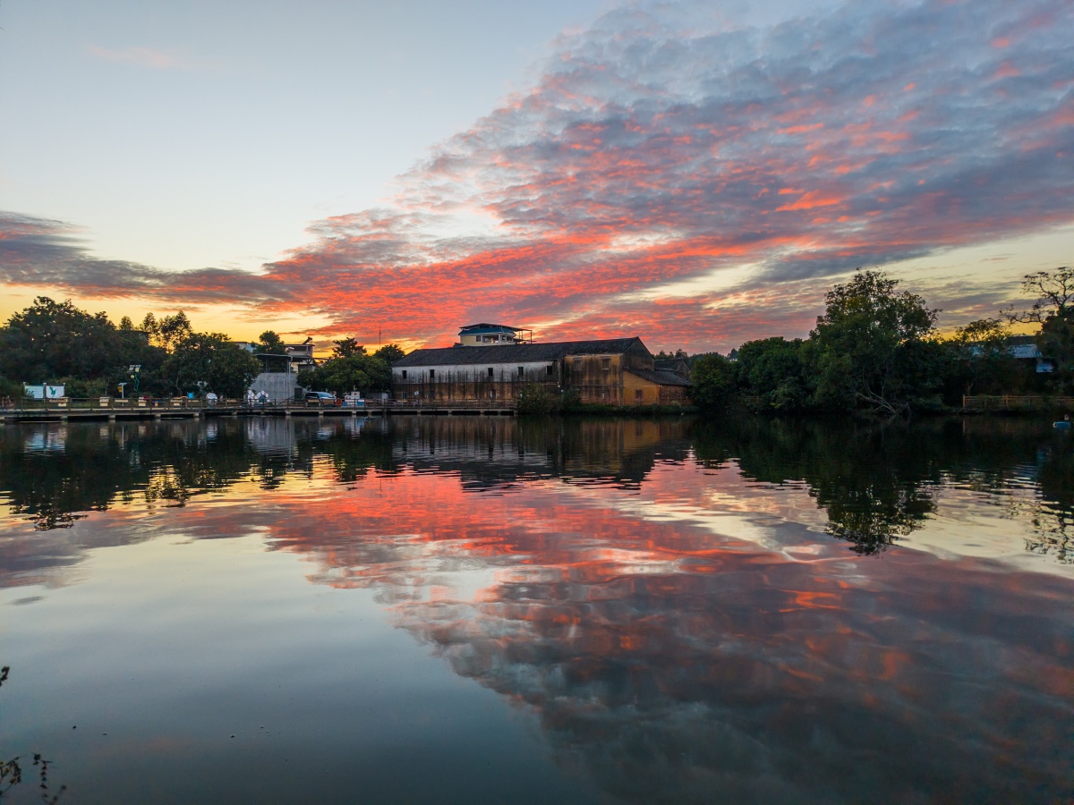 永安村一处古宅前,一池清水映晚霞