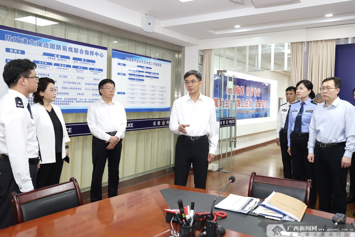 陈刚来到防城港市强边固防前线联合指挥中心,认真听取联合指挥中心运行机制、“双反”打击等工作汇报,现场调度一线联防所、抵边警务室工作情况,对该联合指挥中心发挥总体统筹、联合指挥、协同作战、督办落实等功能给予肯定,要求强化情报分析,总结以往案例,紧盯主要矛盾和突出问题,挑选最硬骨头和最难对象依法严厉打击,汇聚打防管控整体合力。在防城港市公共仓储物流服务中心,陈刚现场察看涉私船舶、车辆等物品,听取涉私船舶、车辆管理处置工作情况汇报,要求健全完善涉嫌走私船舶、车辆处置机制,依法依规做好移交、保管、拆解、拍卖等工作,严厉打击公职人员走私护私等行为。陈刚乘船来到防城港市珍珠湾海上联防所,听取拦阻设施建设、“三无”船舶治理、海陆岸线网格化管理等情况汇报,要求认真总结好做法好经验,切实提高人防、物防、技防水平,持续壮大打击声势,始终掌握打击走私偷渡工作主动权。