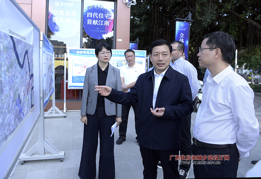 自治区住房城乡建设厅党组书记、厅长杨绿峰(右二)率队到南宁市江南区白沙片区城中村改造项目开展实地调研,南宁市副市长潘国雄(右一)陪同调研