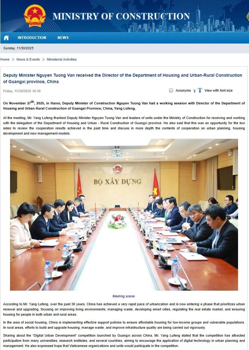 据越南建设部官方网站和越南建设报消息,2025年11月27日,越南建设部副部长阮祥文在越南河内会见中国广西壮族自治区住房和城乡建设厅厅长杨绿峰一行,双方举行工作会谈,就城市更新与住房发展经验等展开深入交流。